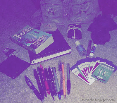 Top to bottom, left to right: WalletLock (to secure my bag at work)A notebookA book (I mean...that one is hard :P)A leather bag of change--I needz coffee!Yes, that is an Ipod Classic (5th Generation)--mandatory for my commute!An Umbrella--I told you it had a +5 Holding stat!Hand sanitizer I've never used. Hey, it was free!Lipstick and chapstick. The lipstick is just in case my chapstick gets sucked away into the void (it has happened on occasion). My lips get extremely dry. I need more pens. I do not have enough.Old Dart passes--I always end up tossing them into my bag when they are used up!** Not in my bag right now, but is always a part of my work commute **My lunchAn extra shirt