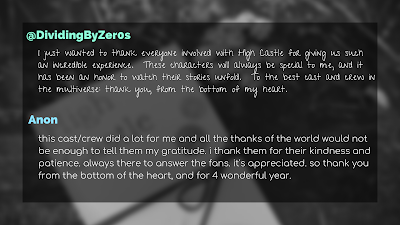 With Season 4 approaching faster than a train with rockets, I wanted to do something a little different. It's time to let the cast & crew of The Man in the High Castle know how much we appreciate them! I created a form to allow everyone to leave a note, anonymously or with their Twitter handle.