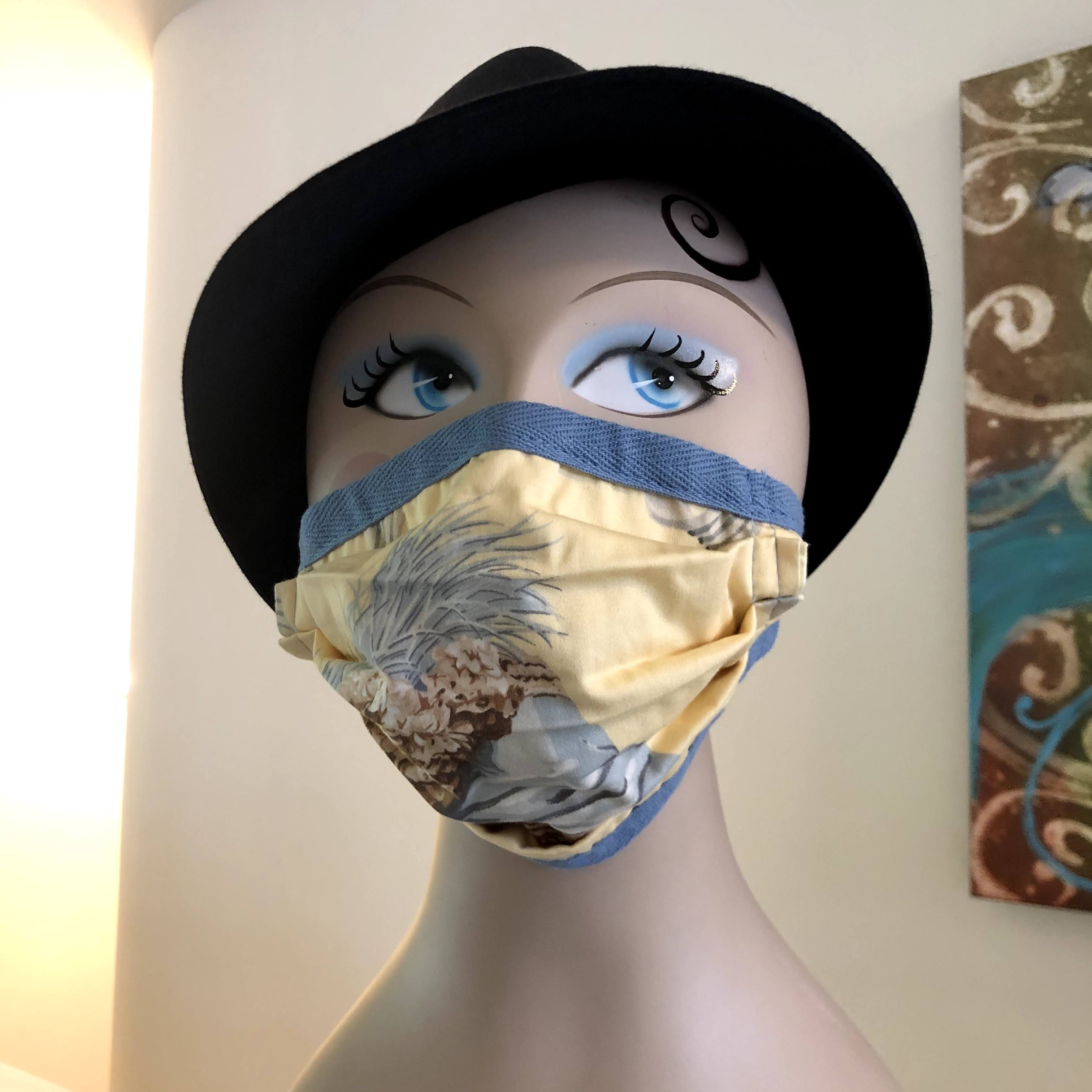 The masks are made from two layers of woven cotton fabric with blue cotton twill-tape ties. They're the pleated surgical mask style, as that allows for the full hat image to be visible when worn. (They do not have a nose wire--you can easily add one yourself if you like.)