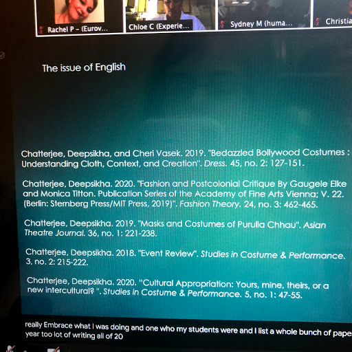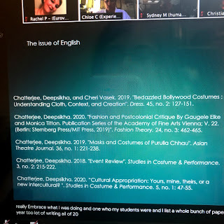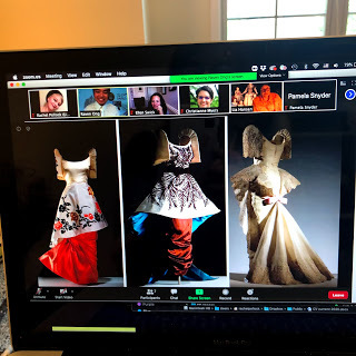 I did make it to the sessions on May 31, the final day of the conference. The organizers all spoke about how they felt approaching the end of this unprecedented "meeting of the minds" in our field, and then they split us out into 5-person discussion groups randomly generated by the Zoom app. My group talked about various things, including how we might engage meaningfully in interdisciplinary studies, how overwhelmed we felt by all kinds of mind-blowing revelations/propositions, and also we acknowledged how stressed and scared we all were for the future of theatrical costume in a post-COVID world. We brainstormed about other fields which could use our expertise (fashion, video games, TV/film) and we shared our schools' plans (or lack thereof) for the fall.