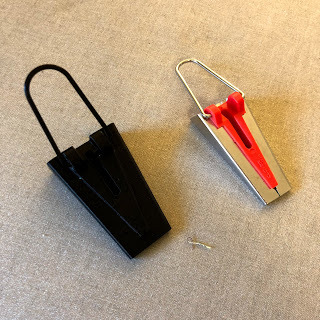 I was pleasantly surprised when I picked mine up from a bin on Kyle's porch: it was basically just like my Dritz tape makers, but all plastic! (See above photo.) You have to be careful about getting the iron or its jetting steam too close to the tool since it's made of thermoplastic and can deform, and the fact that the pull loop is not metal makes it more fragile than a traditional metal tool, but if you adjust your usage to accommodate its properties, the 3D print tool works great!