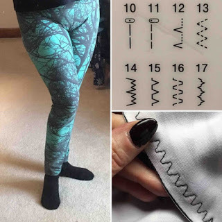 My cotton Lycra leggings at left. I used the serpentine stitch #16, as shown at bottom right.
