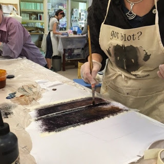 In the midst of this process. renowned Broadway fabric painter Margaret Peot came to lead our grad students in a surface design workshop, and she conducted a demonstration of the type of paint samples she would create, if this were a project being built by the shop which employs her.