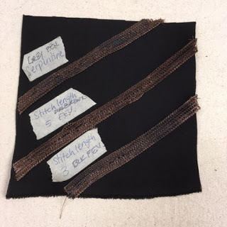 If you take a look at the research pinboard for this project, you'll notice in some images that the stillsuits have a "stripey" design element in sections, which we referred to in the shop as "filtration tubes." in addition to the samples we created for the pad structures, we also made various samples for these filtration sections using actual filtration mesh dyed, stitched and painted in various ways. This image shows one of those samples.