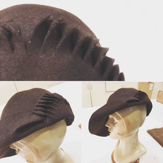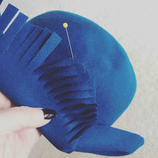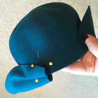 Above is a detail shot illustrating how to take a tuck in each side of the brim arc. I've pinned mine in place with quilt pins and at this stage, i adjusted those pleats in the mirror a few times til i got a good shape that I liked. Then i tacked each side down securely.