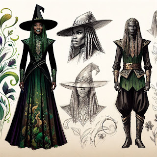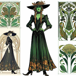 But regarding this post, I thought I could instruct Microsoft Copilot to pull sketches from the blog and use them to inform the style of the costume design rendering I prompted it to produce. I hoped it would generate a version of the Elphaba series that looked like I could have drawn it.
