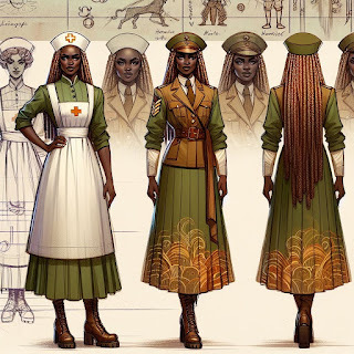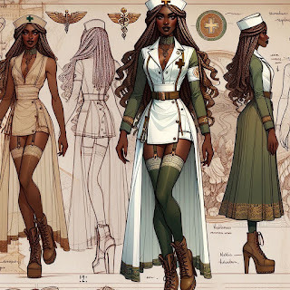 Like, it’s a great way for someone with no confidence in their ability to draw to generate something that looks kind of like what they wanted, & it’s a great way to open up creative possibilities that would not have otherwise come to mind (like the WWI nurse burlesque concept art here). But I find myself continually frustrated by not being able to control something like the style of shoes she’s wearing, or the spacing of the buttons on his uniform.