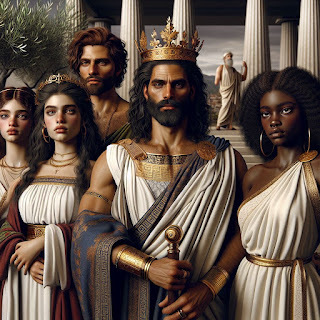 Honestly, not bad. I then asked it to tell me the plot of Sophocles’ play Antigone. I asked for a portrait of King Creon with his two adult daughters and son in Ancient Greek clothing & got this: