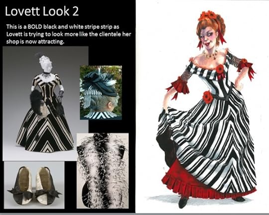 In Bill Brewer's designs for Mrs. Lovett in Sweeney Todd, her second look has a very specific stripe to it. He'd found a swatch of fabric at a New York vendor which he loved, but there were two problems: the vendor sold out of the fabric before the swatches were approved, and in order to match the fabric up the center front in this inverse chevron, one half of the skirt would have had to be cut inverted, which creates a visual anomaly in textiles with satin weaves.