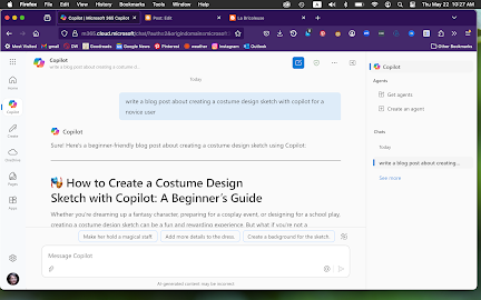 After attending a conference session on using AI in costume design, I was inspired to use my university's Microsoft Copilot AI tools to write a blog post about how to use it for this purpose, aimed at a complete novice. Here's what it wrote verbatim and unedited: