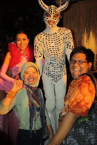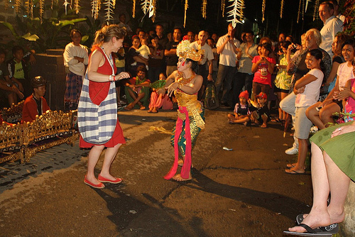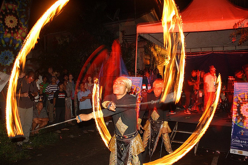 Setelah kenyang makan malam, kami pergi ke Jalan Gotama untuk ikutan UWRF Street Party. Seru sekali. Sepanjang jalan Gotama ditutup untuk street party ini. Dimulai dengan agak membosankan, acara semakin panas setelah rapper asal Amrik mulai perform, fire dance pun bikin kita kipas-kipas dan puncak-nya saat band beraliran reggae menghentak dengan lagu-lagu rasta-nya. Three of us are having a great time, in sync with everybody's happy mood
