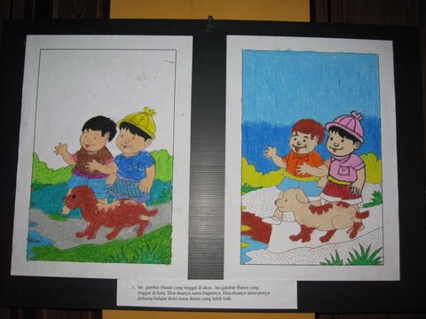 Gambar di atas adalah hasil karya dua orang anak yang tinggal di tempat yang berbeda. Salah satu tinggal di kota dan satunya lagi di desa. Tentu saja hasilnya sama bagus. Jika begitu, kenapa kita harus menyia-nyiakan bakat dan minat anak-anak usia dini di pedesaan? Itu lah yang kira-kira mendasari Program Balita Cerdas yang merupakan hasil kerjasama antara P&G dan Unicef. Dengan mengusung tema LLT - Live, Learn & Thrive dimana akses kesehatan dimungkinkan sehingga anak dapat belajar dengan lebih