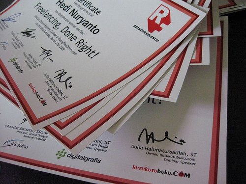 Ruang Freelance dan Oxford Business College didukung oleh Digital Grafis dan Kutukutubuku.com mengadakan seminar Freelancing, Done Right pada hari Sabtu, 21 Maret 2009 di Cafe au Lait Cikini. Kebetulan saya jadi pembicara juga untuk sesi ketiga. Seminar tersebut mainly membicarakan bagaimana starting menjadi freelancer, lebih lanjut menjalani kehidupan freelancing dan next step ke entrepreneurship.