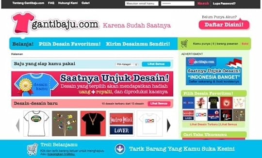 Dengan GantiBaju.com kamu bisa memasukkan design-design kamu sesuai dengan tema bulan ini (Tema yang pertama adalah Indonesia Banget), then let calon pembeli vote the best designs of the month, kemudian 5 design yang di-vote dengan nilai tertinggi akan mendapatkan hadiah uang dan kesempatan dapet royalti 10% untuk setiap kaos yang terjual. Menarik? Banget! Coba sekarang