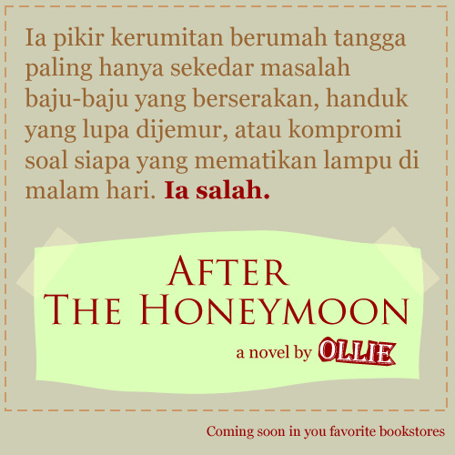 This is my latest novel after years [image error] Gagas Media challenged me to write some kind of domestic fiction. Ceritanya lebih mature, lebih serius, tentang hidup, tentang cinta, dan tentang keluarga. I wrote this in 30 days, just several weeks before my wedding day. People asked whether this is a true story (or MY STORY in particular). Well, the story is inspired by a true story, but of course more imagination playing. Ceritanya tentang bagaimana kehidupan rumah tangga itu mungkin nggak semudah yang di