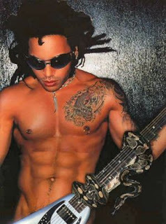The dreads may have gone for good but the piercings are still very much in evidence. Six diamond studs and hoops in his left ear, one on either side of his nostrils. Lenny has, he tells me triumphantly, another three piercings that are out of my sight. One silver ring in each nipple and a third, that he refers to as "the family jewel", hidden beneath his flared jeans. "I enjoy having them done," he says with a satisfied smirk. He claims that being a sex symbol is the "furthest thing" from his mind. He finds it absurd that a musician who doesn't even comb his hair should be an international pin-up.