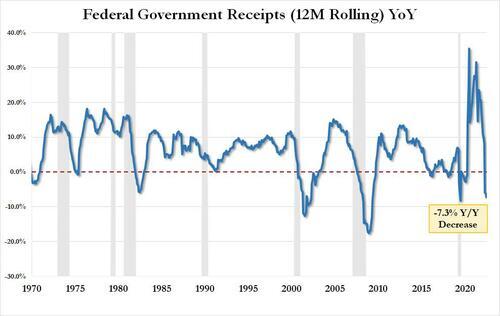 … while tax receipts slumped 9.2% from $461 billion to $418 billion, resulting in a TTM government receipt drop of over 7.3%, the biggest since June 2020 when the US was reeling from the covid lockdown recession; in fact never have before tax receipts suffered such a big drop without the US entering a recession.