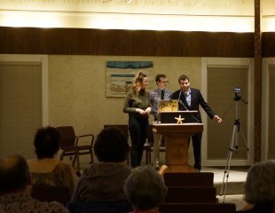 Adam Eichen, Rabbi Michael Pollack, Emmie DiCicco speaking at a March on Harrisburg barnstorming event at the UU Fellowship of Erie, PA. February 19, 2018