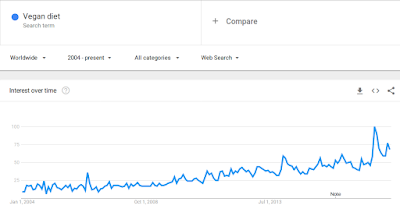 If “macrobiotic” is a dying meme, that’s not true for “vegan” which is still showing growth in both Google Ngrams and Google Trends, the latter showing the number of times that a term is searched for in the Web. Here are the Google Trends data: