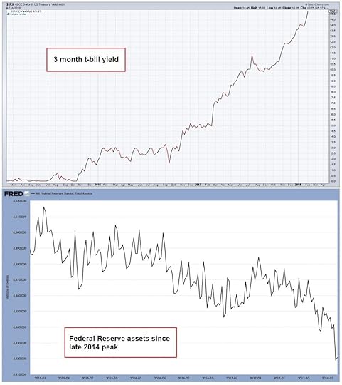The tree month t-bill yield and total assets held by the Federal Reserve system – moving in opposite directions. Amazingly, many market participants seem to believe that when these data change direction, the stock market will remain unaffected. That is probably wishful thinking. [PT]