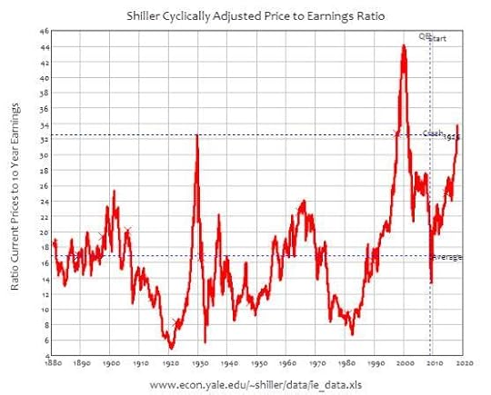 There is only one time that it’s been higher: during the DotCom Bubble, when Robert Shiller’s “cyclically adjusted price to earnings” ratio hit the all-time record of 44 to one. That means that the average price of a share on the S&P500 was 44 times the average earnings per share over the previous 10 years (Shiller uses this long time-lag to minimize the effect of Ponzi Scheme firms like Enron).