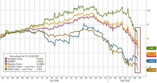 Europe’s 600 Index, down -1% as of this moment and back to session lows after a modest rebound earlier, was set for its worst week since 2016 as banks and financial-services stocks led most industry sectors lower. The drop, however, was relatively modest and followed a sheer plunge in Asia, where stocks tumbled across the region, wiping out most of their gains from the previous two sessions. The Shanghai Composite recouped some gains to close down “only” 4.1% – in what has now been a two-week selloff without the Chinese National Team making an appearance and buying stocks – the Hang Seng was down 3.1% with losses across all sectors. Tokyo’s Topix closed down 1.9 per cent.