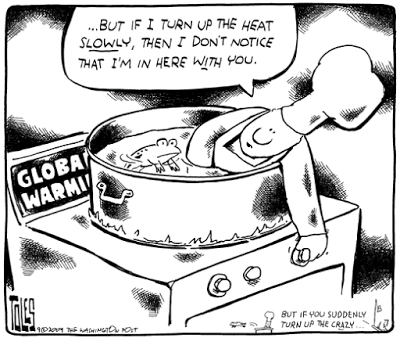 Maybe one day some really gigantic-awful-horrible-monstrous-humungous climate related disaster will hit us. And that, at that moment, people will stop playing the boiling frog and will be forced to admit that climate change is real and we have to do something about that.