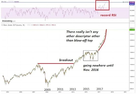 I submit that the past 9 years of market “recovery” is nothing but an oversized dead cat bounce that is finally ending. Here is a chart that depicts the final blow-off top phase of the over-extended dead cat bounce: