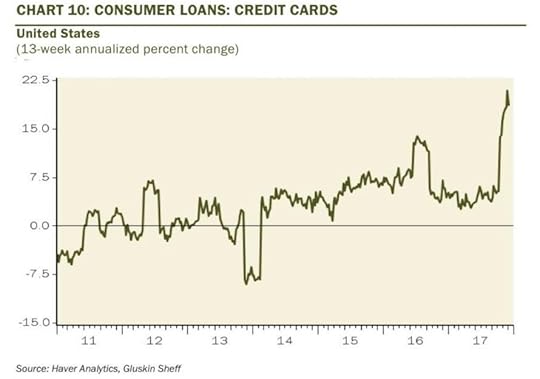 Indeed, recall the stunning Gluskin Sheff chart we presented a month ago, which showed that 13-week annualized credit card balances in the U.S. had gone “completely vertical” in the last few months of 2017 which we said “should make for some great Christmas.”