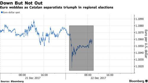 Spanish stocks and the euro fell, while Spanish government bond yields hit their highest levels in over a month after Catalan secessionists delivered an unexpected blow to the government of Spanish PM Rajoy by winning the Catalan regional election. Meanwhile across the Atlantic, U.S. equity futures and the dollar rose on the last trading session before the Christmas holiday. The MSCI index of world stocks was flat.