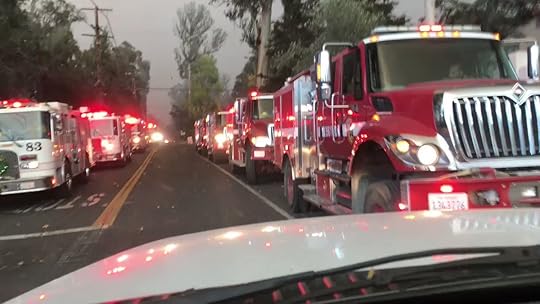 #ThomasFire– Dozens of Fire engines staged and await orders at the corner of Sycamore Cyn Rd and Cold Springs Road in Montecito Sunday morning.