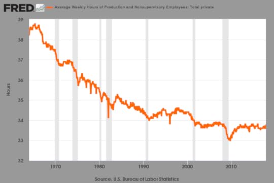 The reason isn’t hard to figure: The US economy is generating fewer and fewer goods producing jobs where the work week averages 40.5 hours and weekly pay equates to $58,400 annually and far more bar, hotel and restaurant jobs, where the work week averages just 26.1 hours and weekly pay equates to only $21,000 annually.