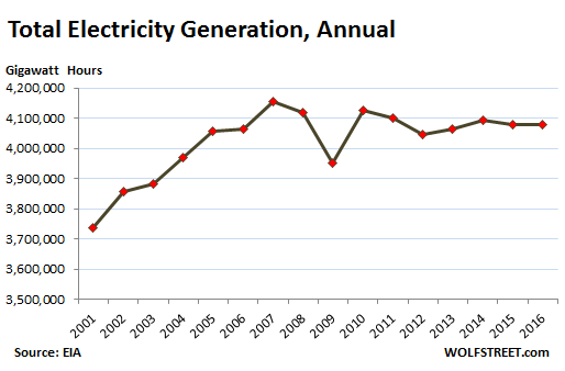 The chart below, based on data from the Department of Energy’s EIA, shows annual electricity generation from 2001 through 2016. Note the growth in generation through 2007, the plunge during the Financial Crisis, the recovery, and the uneven decline since: