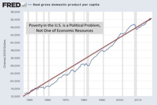 Graph: Real (inflation-adjusted) Per Capita GDP is more than double today what it was in 1970. In the U.S. in 1970 mass starvation was notably absent. So people could conceivably not only get by if U.S. GDP were halved, but could thrive. The problems with doing so are (1) social complexity has been built into the political economy and (2) unwinding this complexity requires planning and the political will to do so. However, climate crisis poses the threat of unplanned degrowth of similar or greater magnitude. Source: St. Louis Federal Reserve