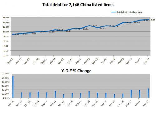 As shown in the chart below, a Reuters analysis of 2,146 China listed firms showed their total debt at the end of September jumped 23% from a year ago, the highest pace of growth since 2013. The analysis covered three-fifths of the country’s listed firms, but excluded financials, which have seen the brunt of government de-risking and deleveraging efforts so far.