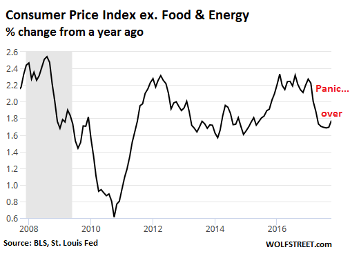 But the retreat was repeatedly brushed off as “transitory” by Fed Chair Janet Yellen and other Fed governors, starting in June, when they vowed to continue raising rates “gradually” and proceed with the QE unwind. Yellen had specifically pointed at a few of those “transitory” factors. These factors are now turning around. Core prices have re-accelerated their increases.