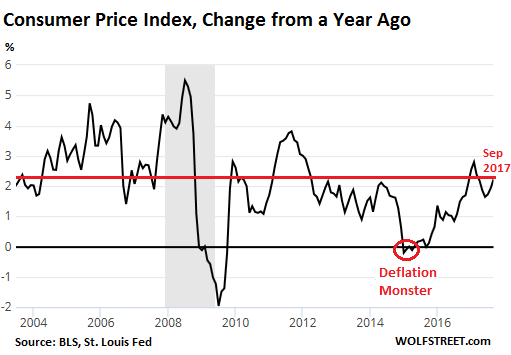 Consumers are going to shell out more money for the same stuff, that’s for sure. Inflation as measured by the Consumer Price Index jumped 2.2% in September compared to a year ago, the Bureau of Labor Statistics reported this morning. All fingers pointed at energy costs: the index jumped 10.1% year-over-year. Within it, “motor fuel” prices (gasoline and diesel) jumped 19.2%.