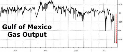 Thanks to Harvey, and now Nate, natural gas production in the Gulf of Mexico has plunged to the lowest level in three years. Gulf gas output may drop as much as 1.4 billion cubic feet a day, while 1.1 million barrels a day of offshore oil production and 3 million barrels of refining capacity are at risk, according to Shunondo Basu, an analyst at Bloomberg New Energy Finance.