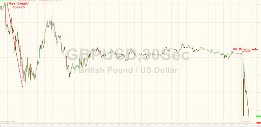 In an otherwise boring day, when Theresa May failed to cause any major ripples with her much anticipated Brexit speech, moments ago it was Moody’s turn to stop out countless cable longs, when shortly after the US close, it downgraded the UK from Aa1 to Aa2, outlook stable, causing yet another flash crash in the pound.