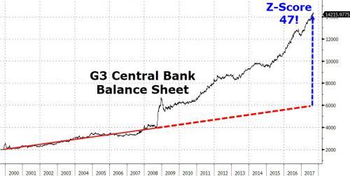 Compared to the ‘normalized’ movement in central bank balance sheets before Lehman; the current (and utterly ridiculous) size of the G-3 central banks balance sheet is 47 standard deviations above trend!!