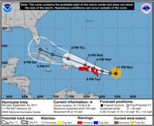 Irma’s eye is expected to pass just north of the heart of the U.S. Virgin Islands on Wednesday and bring four to eight inches or rain and 60-mile-per-hour wind gusts, though the gusts in the most powerful areas of the storm have been as fast as 185 mph, the Daily Caller reported.