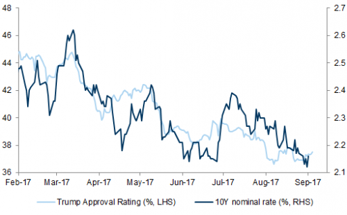 Currie writes that Goldman’s market strategists have found that Trump’s approval rating is a good proxy for this “Washington risk” with a high correlation to both interest rates and gold prices (see Exhibit 1).