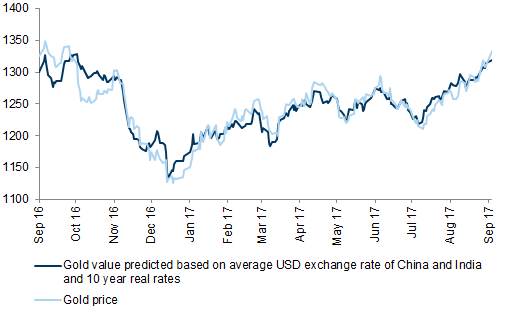 Goldman also notes that the Trump risk premium is reflected in both real interest rates and a weaker US dollar account for 85% of the price movement in gold prices this past year.