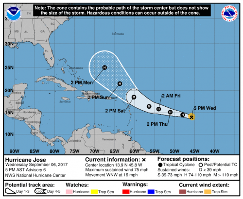Located about 1040 miles east of the Lesser Antilles, Jose is headed at 16 mph on a steady west-northwest track, steered by the same ridge that is helping to direct Irma.