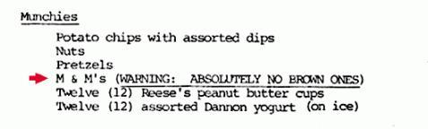 The practice of making these kind of outrageous demands stems from a rider Van Halen inserted into the contract for its 1982 world tour, which insisted on a bowl of M&Ms to be provided backstage, but with all of the brown M&Ms removed.