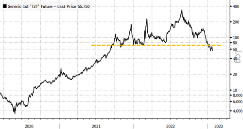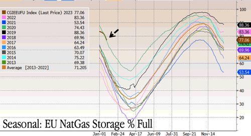 There’s a lot to be happy about in Europe: Dutch front-month NatGas, the continent’s benchmark, slid as much as 5% to 55 euros a megawatt-hour today, the lowest level since late 2021. Prices have collapsed by more than 83% since peaking at 311 euros a megawatt-hour last August.