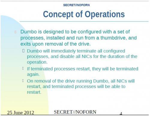 Once installed on a computer running the Windows operating system via a thumb drive, Dumbo identifies webcams and microphones and stops them from recording. The program notifies its operator of any files that were actively being written so that they can be corrupted or deleted, according to the field manual.