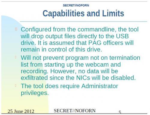 In a field guide for the tool, dated July 2015, the agency says “the intelligence community has identified a need…for a capability to suspend processes utilizing webcams and corrupt any video recordings that could compromise a PAG deployment.”