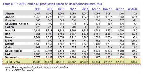 In its just released lastest market report for the month of July, OPEC admitted it has a problem: more than six months after the Vienna deal that was supposed to bring supply and demand in balance, the oil cartel confirmed it is pumping too much, not only in 2017, but also in 2018, blaming shale production as the primary reason behind the oversupply.