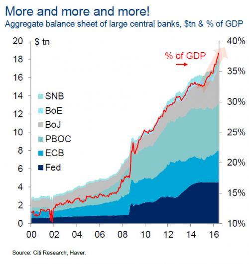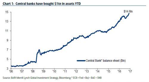 Two weeks ago Bank of America caused a stir when it calculated that central banks (mostly the ECB & BoJ) have bought $1 trillion of financial assets just in the first four months of 2017, which amounts to $3.6 trillion annualized, “the largest CB buying on record.”